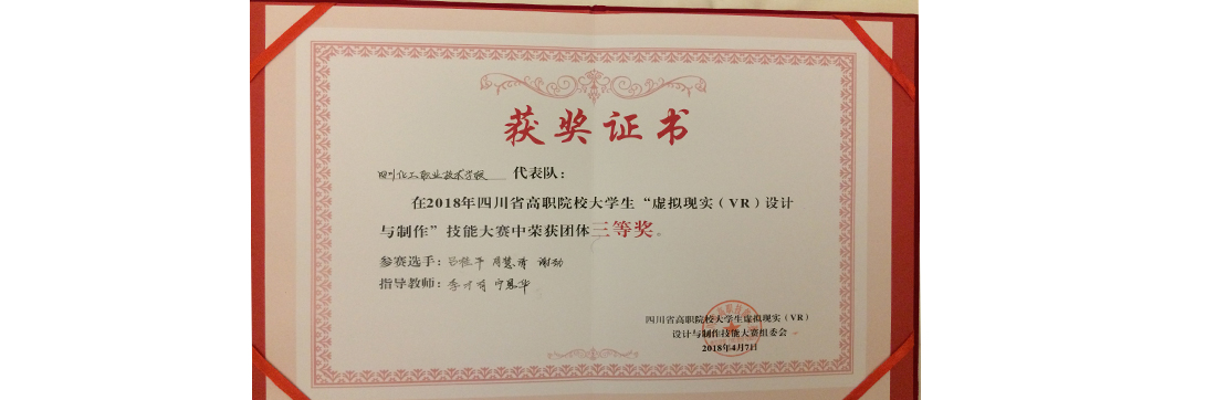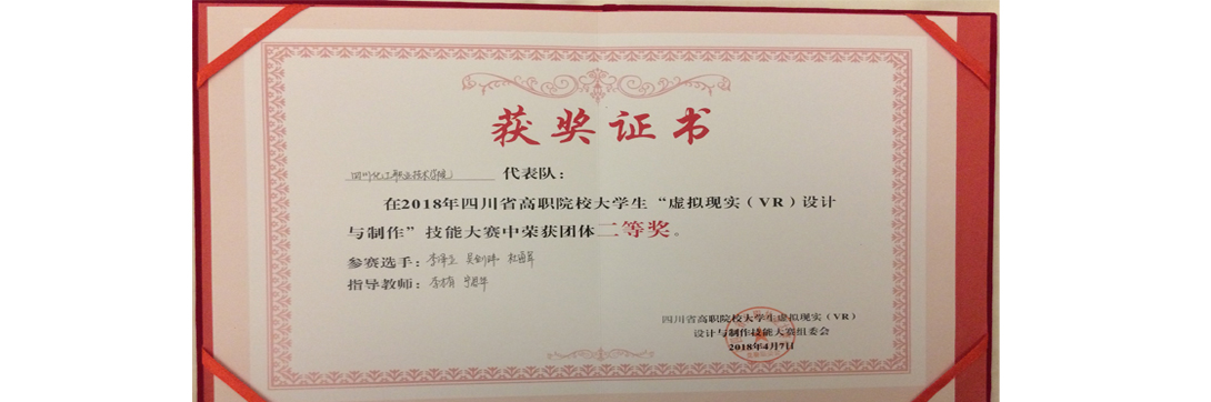 2018年4月7日,四川省高职院校大学生技能大赛虚拟现实(VR)设计与制作技能比赛在四川信息职业技术学院落下帷幕。本次比赛共有来自全省17所高职院校的28个代表队参赛,我院信息工程系软件VR1731班的2支队伍代表学校参赛。经过激烈比赛,由李泽立、吴剑玮、杜海军组成的代表队获得了团体二等奖、由吕桂平、谢劲、周慧清组成的代表队获得了团体三等奖。