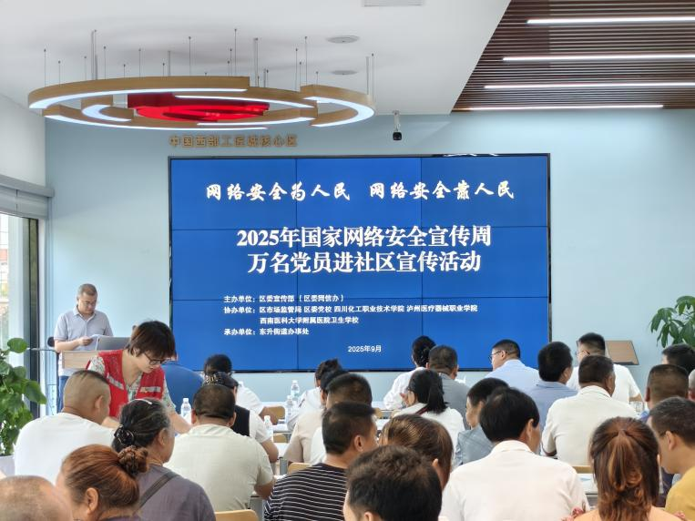 为积极响应“2025年国家网络安全宣传周.万名党员进社区宣传活动”,2025年9月16日,数字经济学院教师党员武江毅、张旭与图文信息中心教师党员林珊组成党员志愿服务队,走进泸州市纳溪区朝阳社区,开展以“网络安全为人民,网络安全靠人民——以高水平安全守护高质量发展”为主题的网络安全宣传活动。