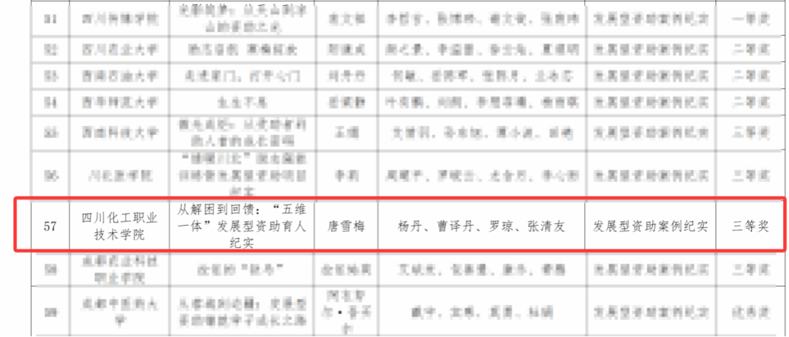 作品围绕“思想引领、技能提升、学业精进、就业创业、素质培养”五大维度,以“青年数智教育志愿服务青年突击队”为载体,推动“扶困—扶智—扶志”有机融合。通过精准认定、六位一体资助政策落实及心理辅导、学业帮扶、就业支持等举措,构建全周期发展型资助体系,助力学生从“受助者”走向“自助者”再到“助人者”。近年来,受助学生积极参与社会实践,服务20余所学校、15家企业、10余个社区,惠及群众超3万人次,并于2025年获四川省六大优势产业立功竞赛(赛育人)三等奖。