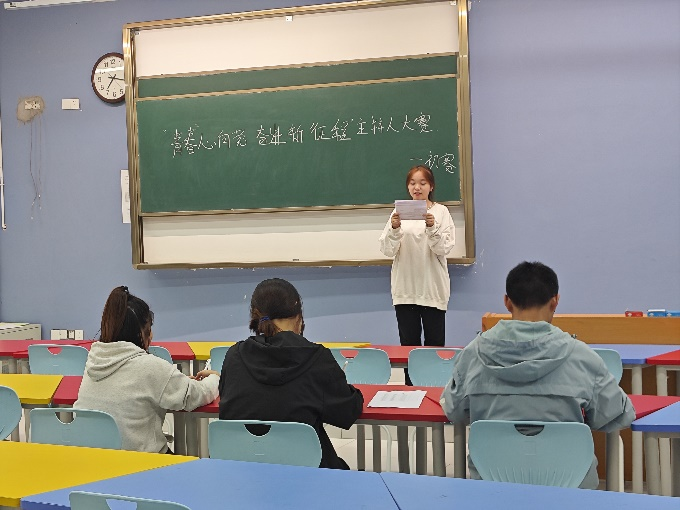 为丰富校园文化生活,2023年10月8日,数字经济学院团总支在勤学楼A108举办“青春向党行,奋进新征程”主持人大赛。