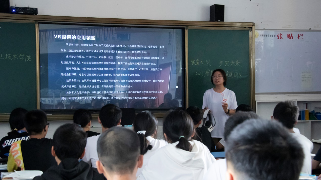 在党浚嘉、王蕊两位指导教师的带领下,实践团队来到了第一站:摩尼镇新苗学校。在新苗学校,团队成员给初三年级的同学讲解了主题为“传承红色基因,汇聚强军力量”的国防知识;分享了学习经验和学习方法;进行了“探索未来世界——VR艺术的全新体验”主题科普教育体验活动。