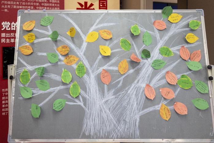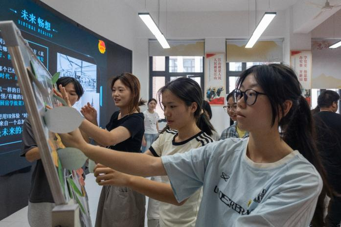 在“VR未来畅想”环节,每位同学领取一片绿叶形卡片,写下对VR技术的美好愿景:“让VR带留守儿童‘走进’父母工作的城市”、“用数字重建消失的楼兰古城”、“在元宇宙为爷爷奶奶重建童年街巷”……这些承载梦想的文字最终汇聚成一棵象征希望的“科技树”,在灯光映衬下逐渐丰茂,寓意青年一代以创新之力描绘未来图景。