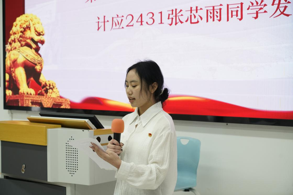 新学员代表张芯雨同学上台发言。她以铿锵有力的话语表达了对学习生活的热切期待,承诺将以饱满的热情和严谨的态度投入青马班学习,在知行合一中书写青春答卷。