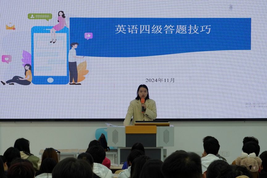为助力同学们攻克英语四级难关,提升英语综合能力,11月22日下午,数字经济学院综合事务部在勤学楼11A107成功举办了一场“英语四级答题及备考技巧”主题讲座,此次讲座邀请了经验丰富的杨丹老师主讲,共100名学生参加。