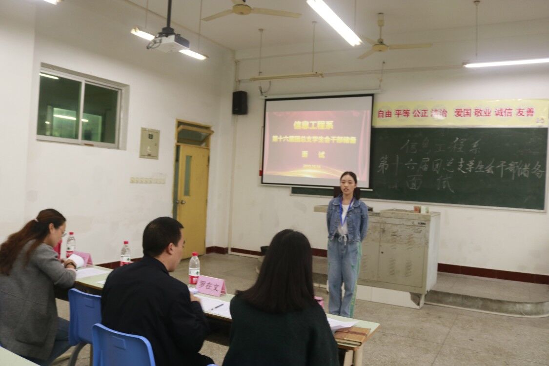 2019年10月15日16点30分,信息工程系第十六届团总支学生会干部面试工作在综合楼A区506教室顺利进行,系分管学生工作副主任罗在文老师、系团总支书记干艳燕老师、王凯瑞老师担任本次面试官。