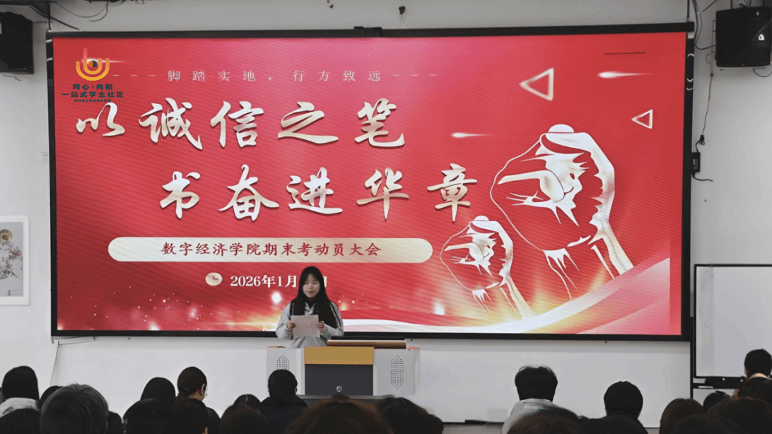 2026年1月15日,数字经济学院在四川化工职业技术学院护国校区11a107教室开展一站式学生社区活动,举办以“以诚信之笔,书奋进华章”为主题的期末复习动员大会。本次大会由学生代表胡玉兰主持,学院党总支副书记罗琼、部分教师代表及180名学生代表共同参与。